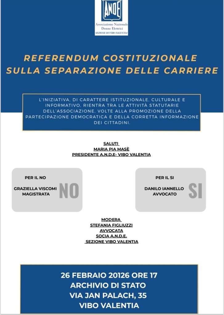 Giovedì 26 febbraio a partire dalle ore 17:00 presso l’ Archivio di Stato di Vibo Valentia si terrà un convegno culturale e informativo incentrato sul referendum Costituzionale sulla separazione delle carriere dei magistrati, cui saremo chiamati a partecipare il prossimo 22 e 23 Marzo.